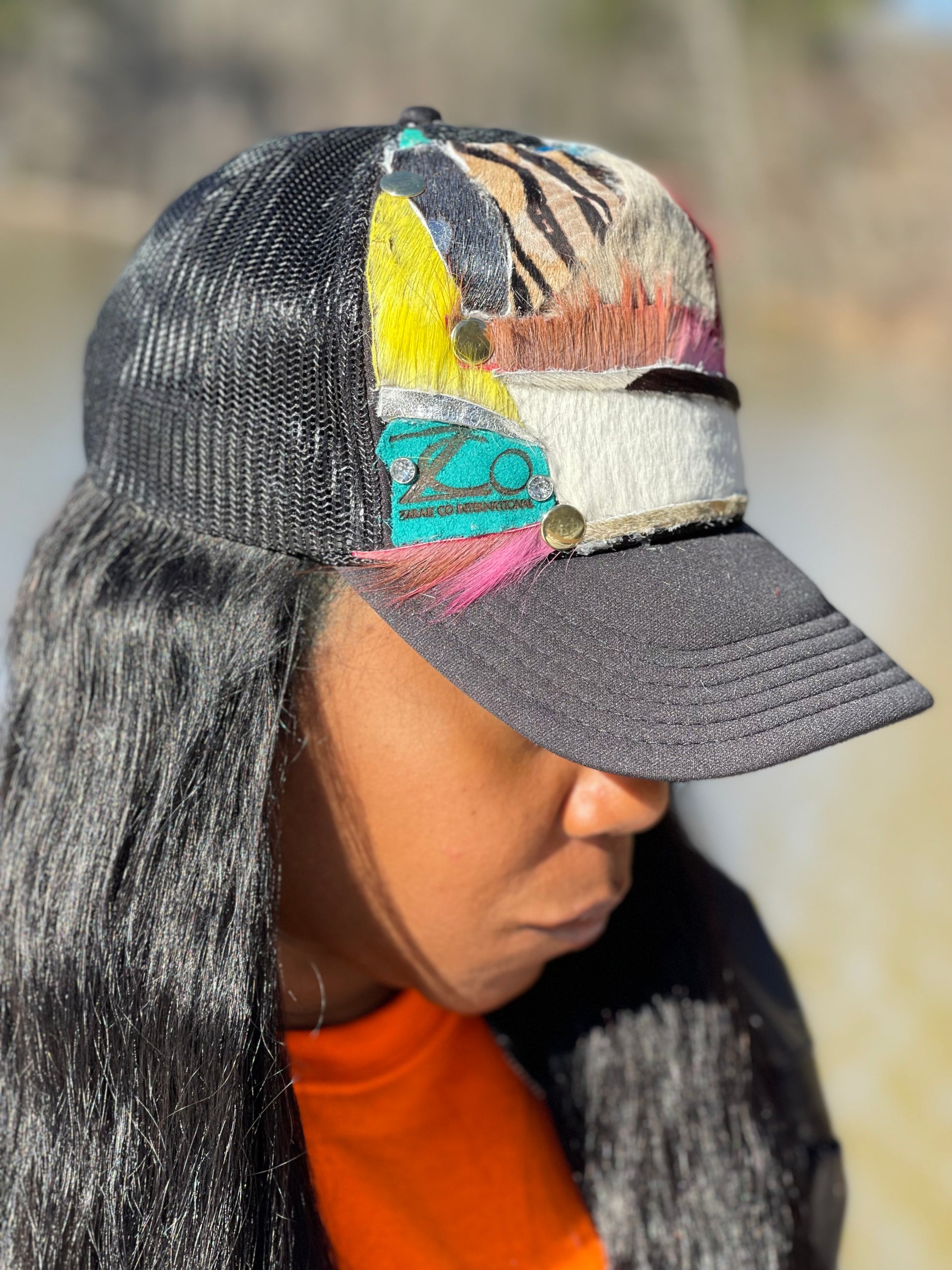 Black Trucker Hat with Adjustable Closure. Black hat has colorful Cowhide with Placement Detail Design and Studded Details.