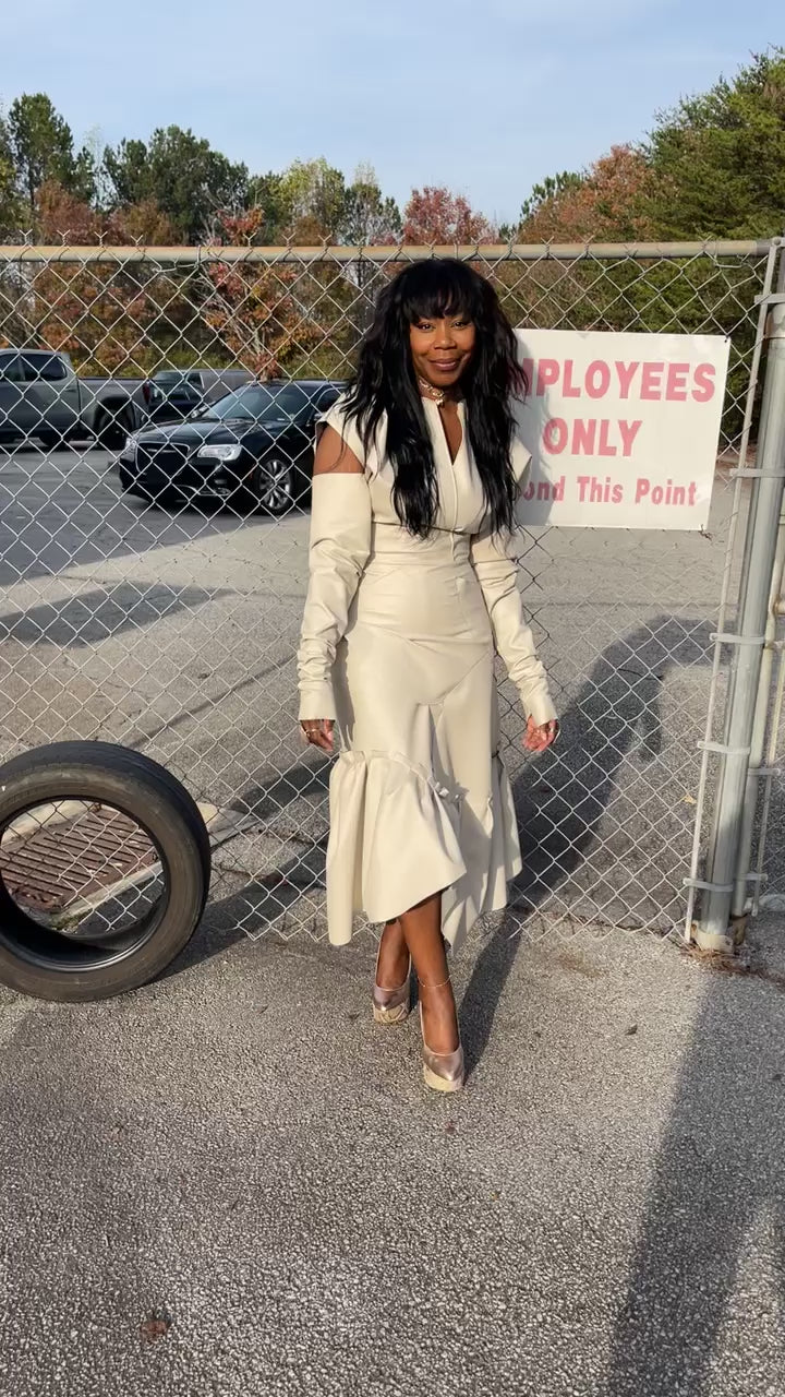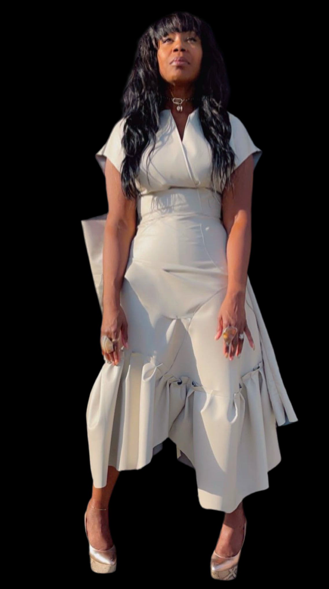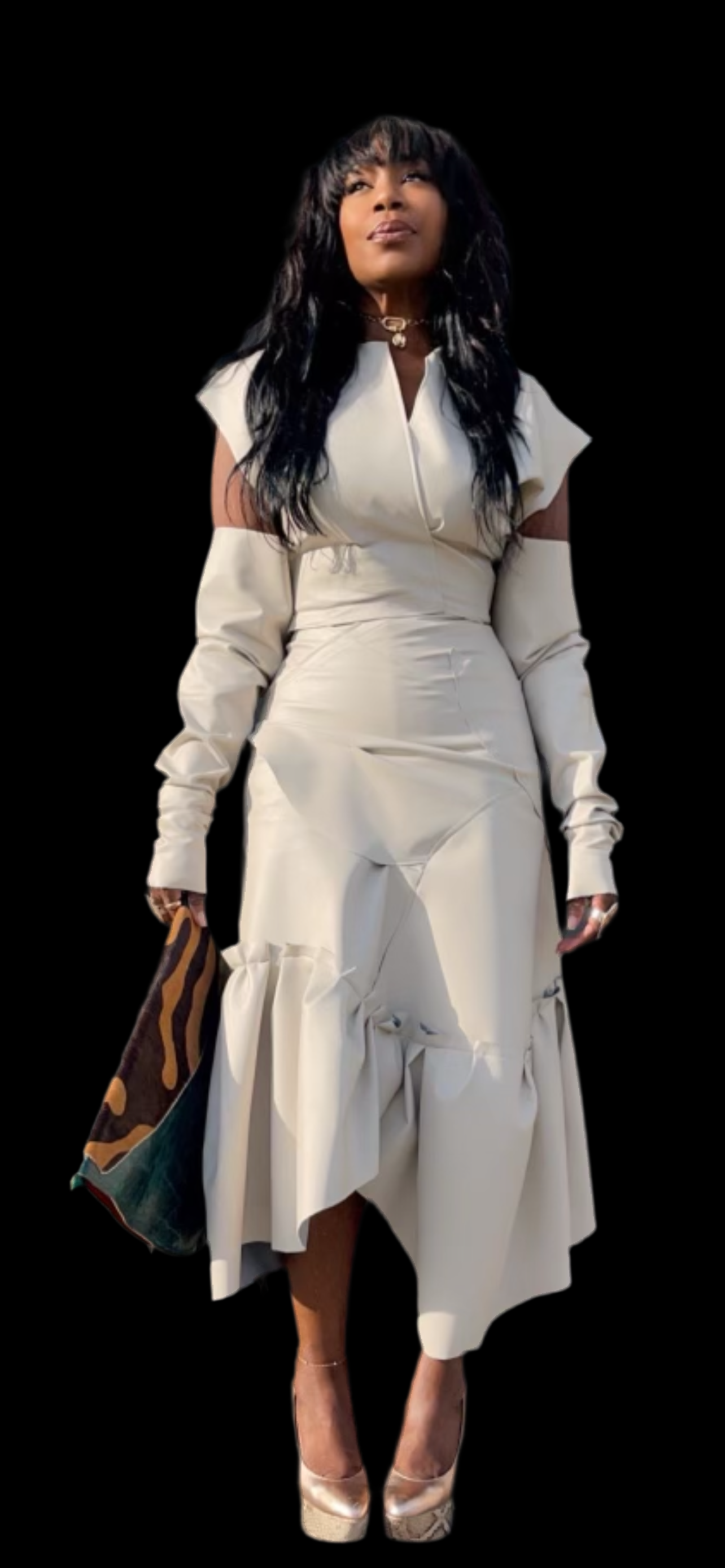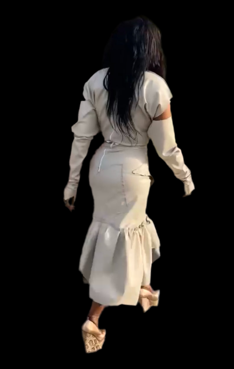 2 Piece Cream Vegan Leather Ensemble with Patchwork Detailing.
