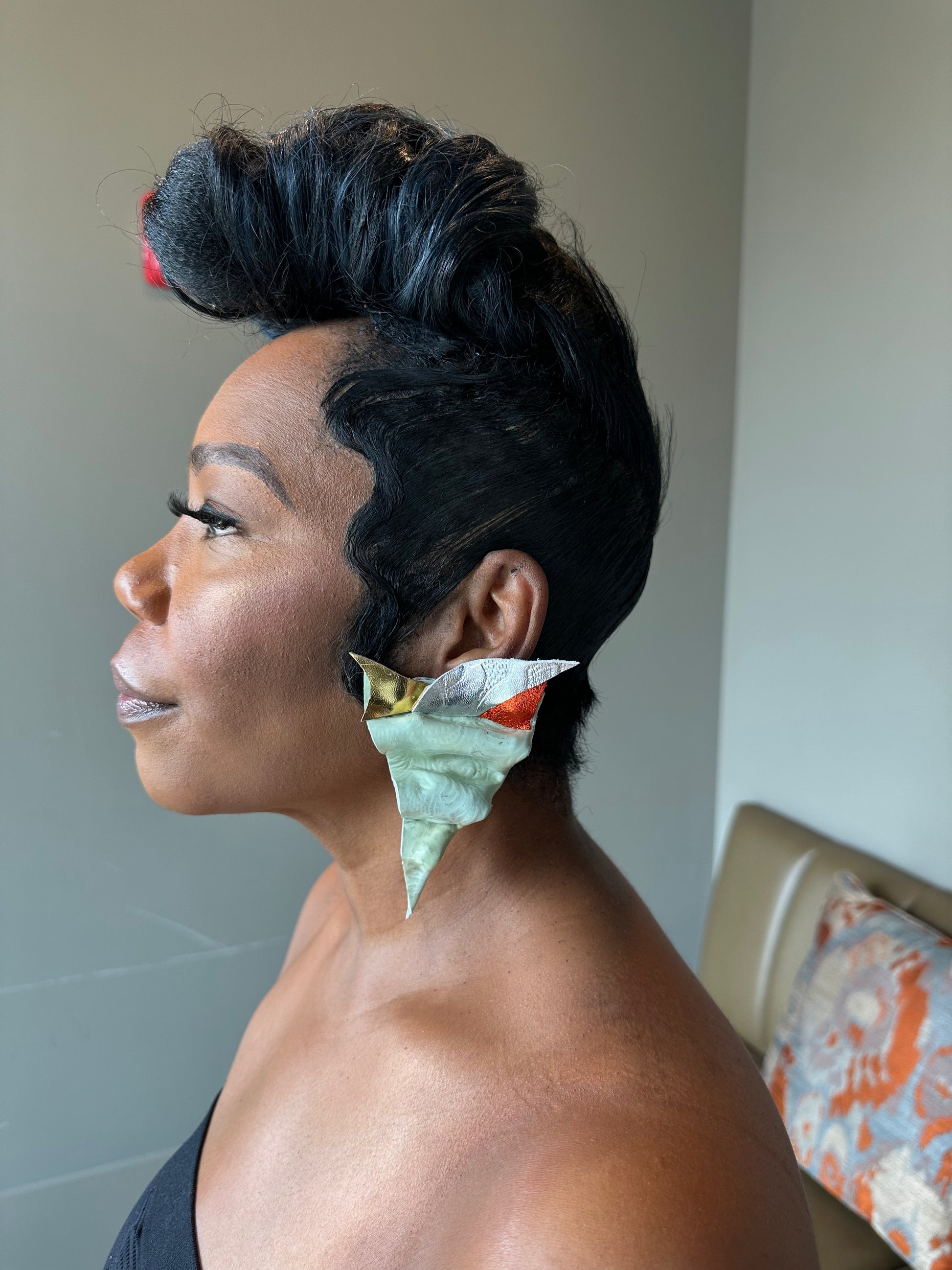 Patent Mint Green Leather Earrings with Triangular Wave Design. Gold / Orange Leather Accents.