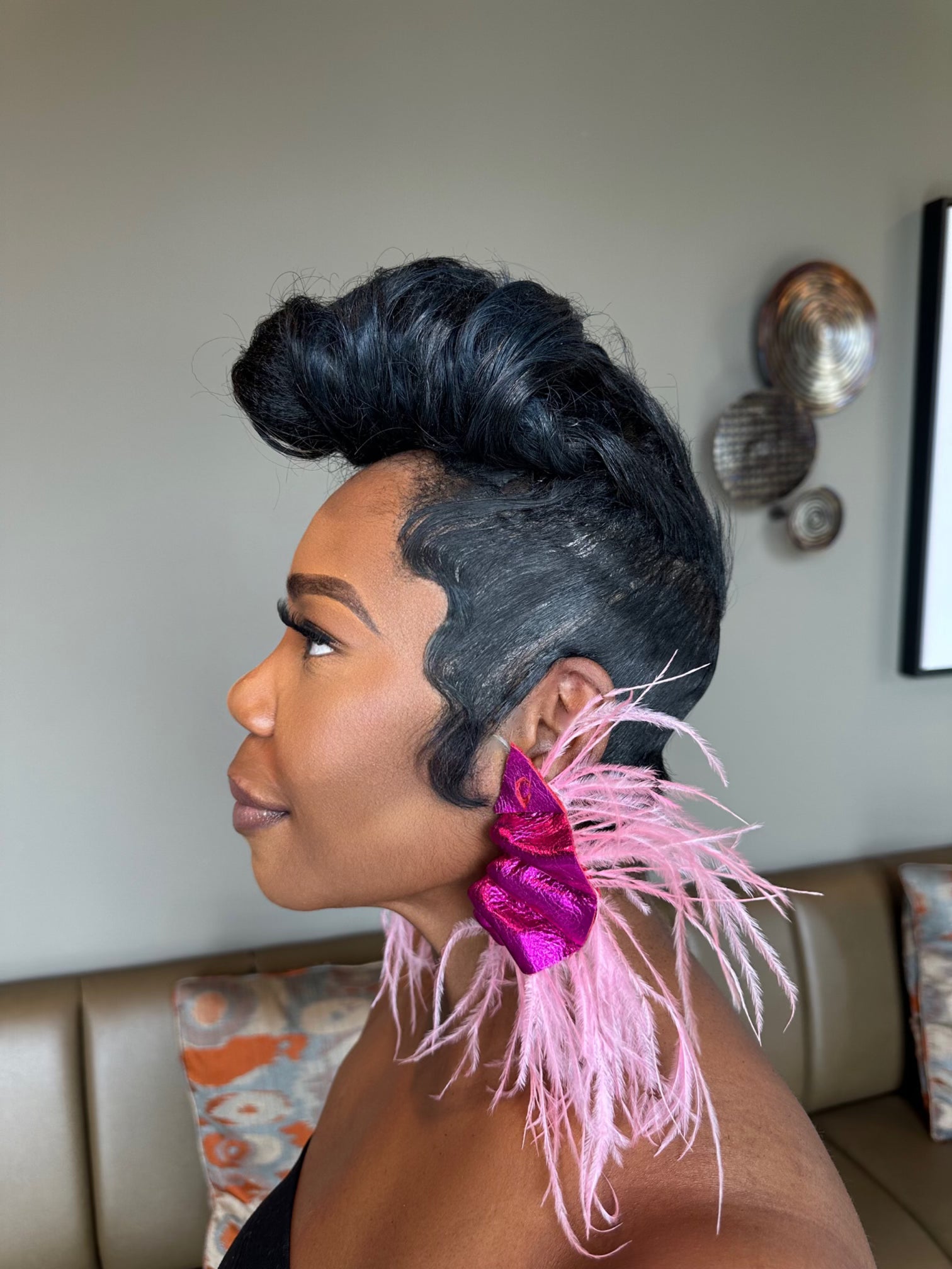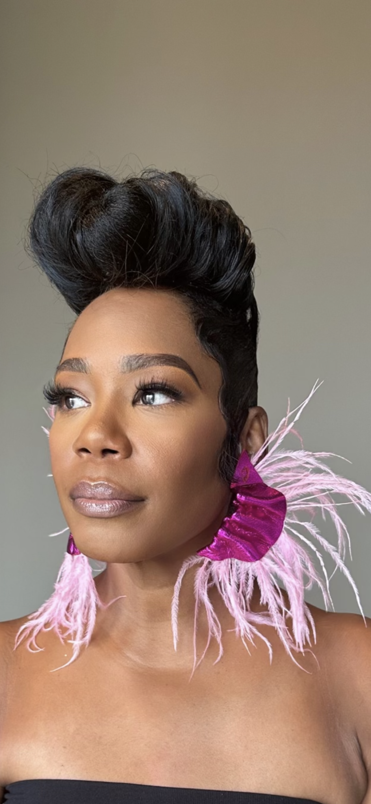 Metallic Pink Leather Earrings with Soft Pink Feathered Details. This Exotic Piece is a Must Have!!! Can be worn with your most Elegant Gown or dressed down with your dopest kicks. Very lightweight. ( Clip Ons)