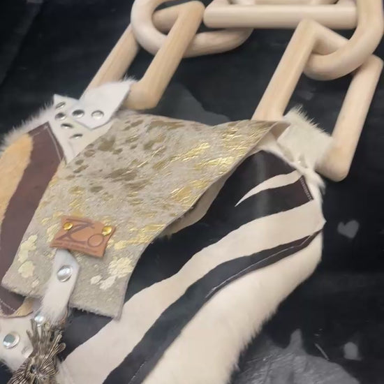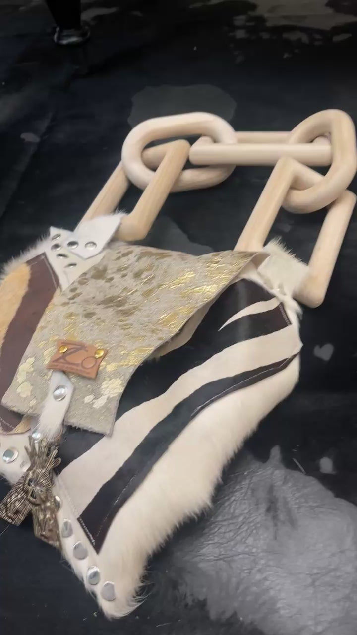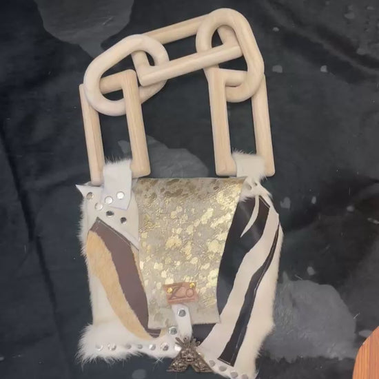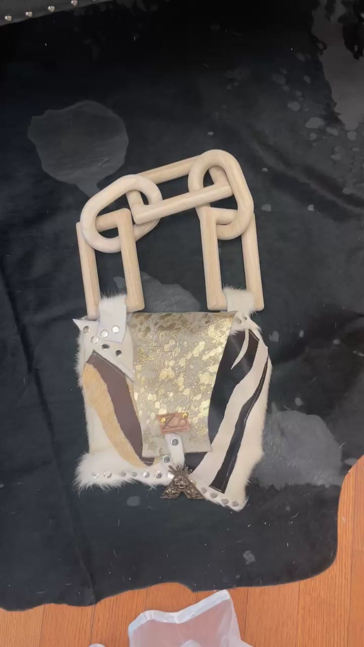 Off White Cowhide Studded Abstract Designed handbag with multiple Hyde prints. Large Wooden Link Handle is a Dope Edgy addition to our one of one handbag. No 2 bags are exactly alike.