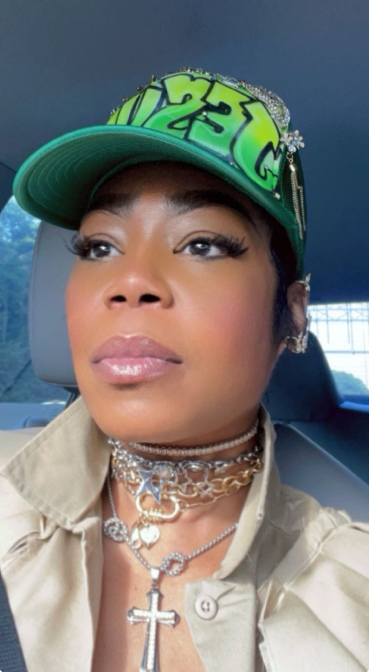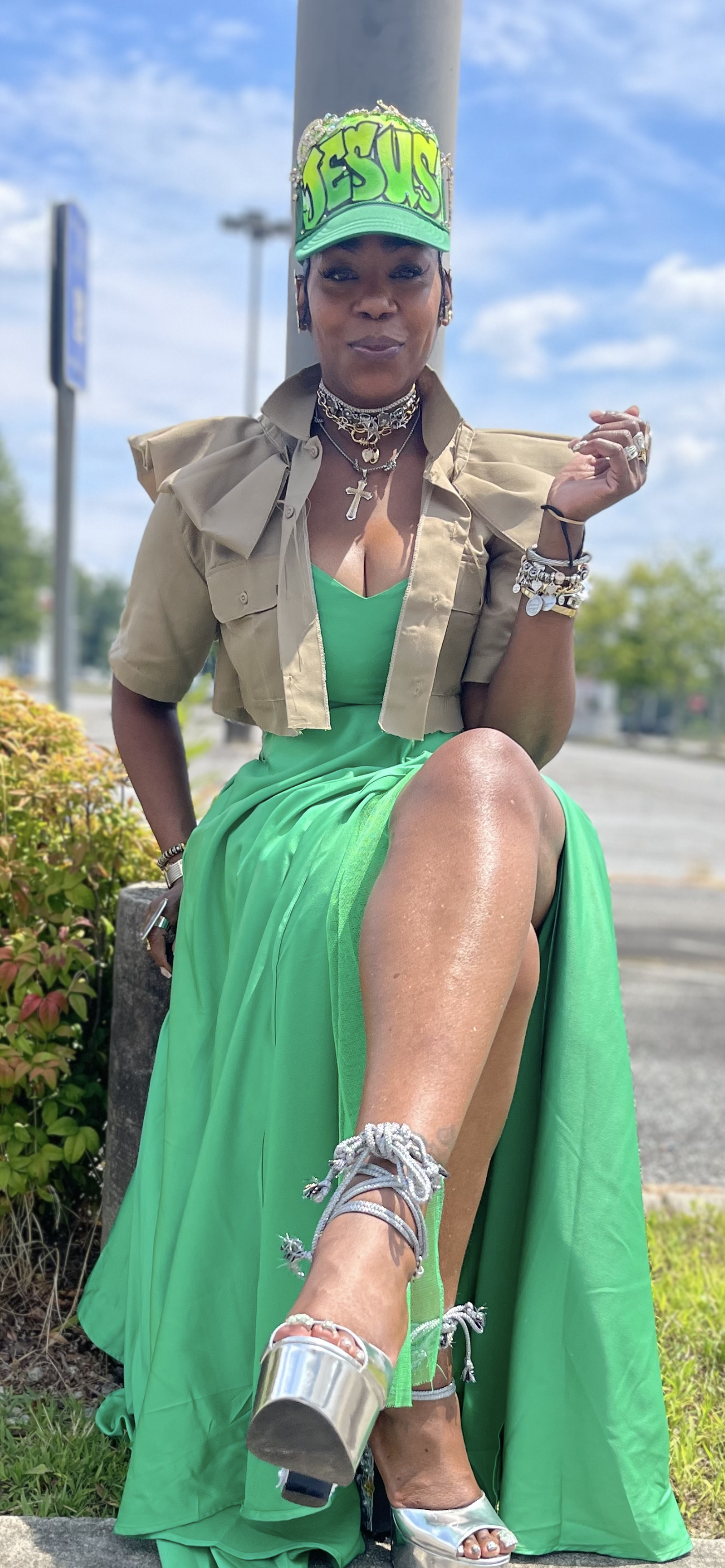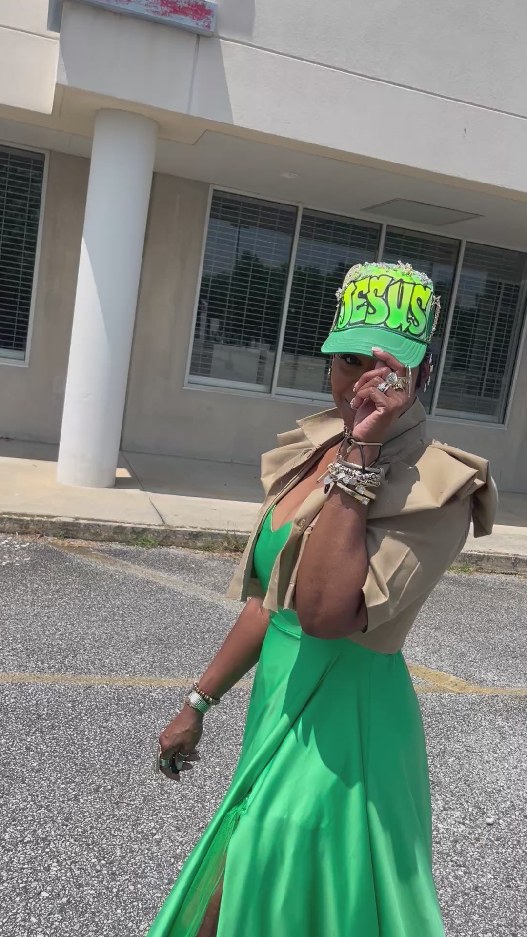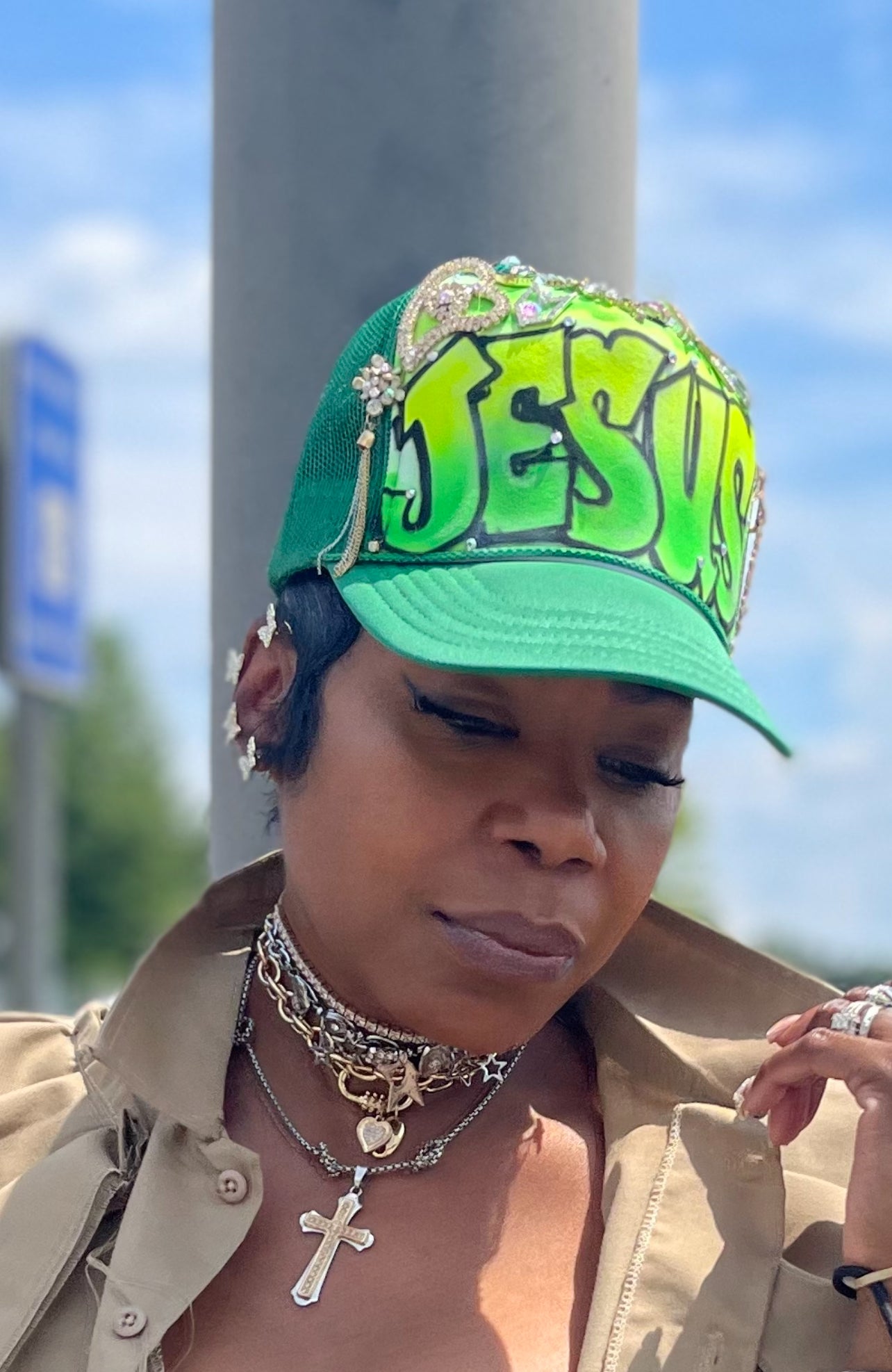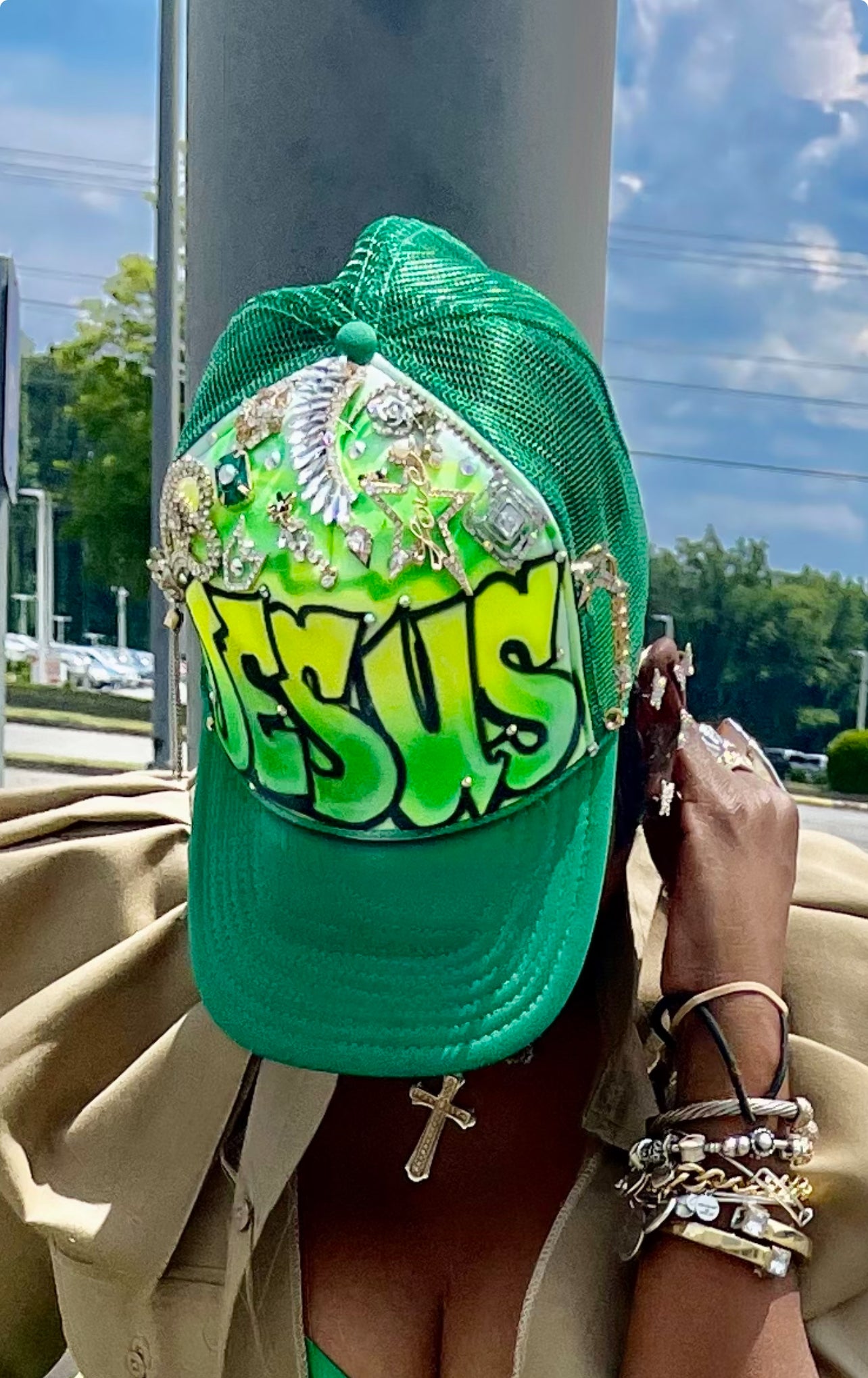 Kelly Green Trucker Hat “ SnapBack” with Oversized Jeweled Rhinestone Embellishments and Bold Graffiti Style Font. ( JESUS )