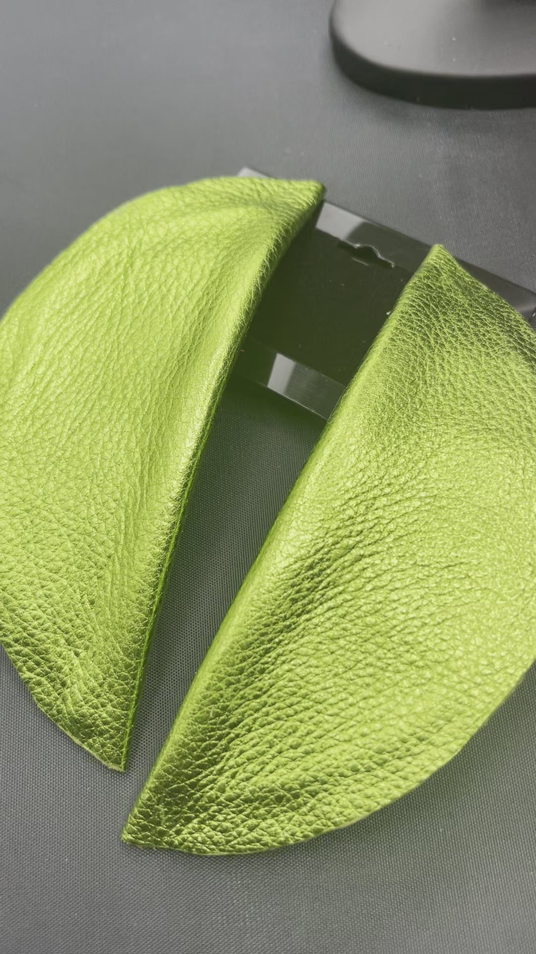 Metallic Lime Green Leather Half Moon earrings with slight curvature.