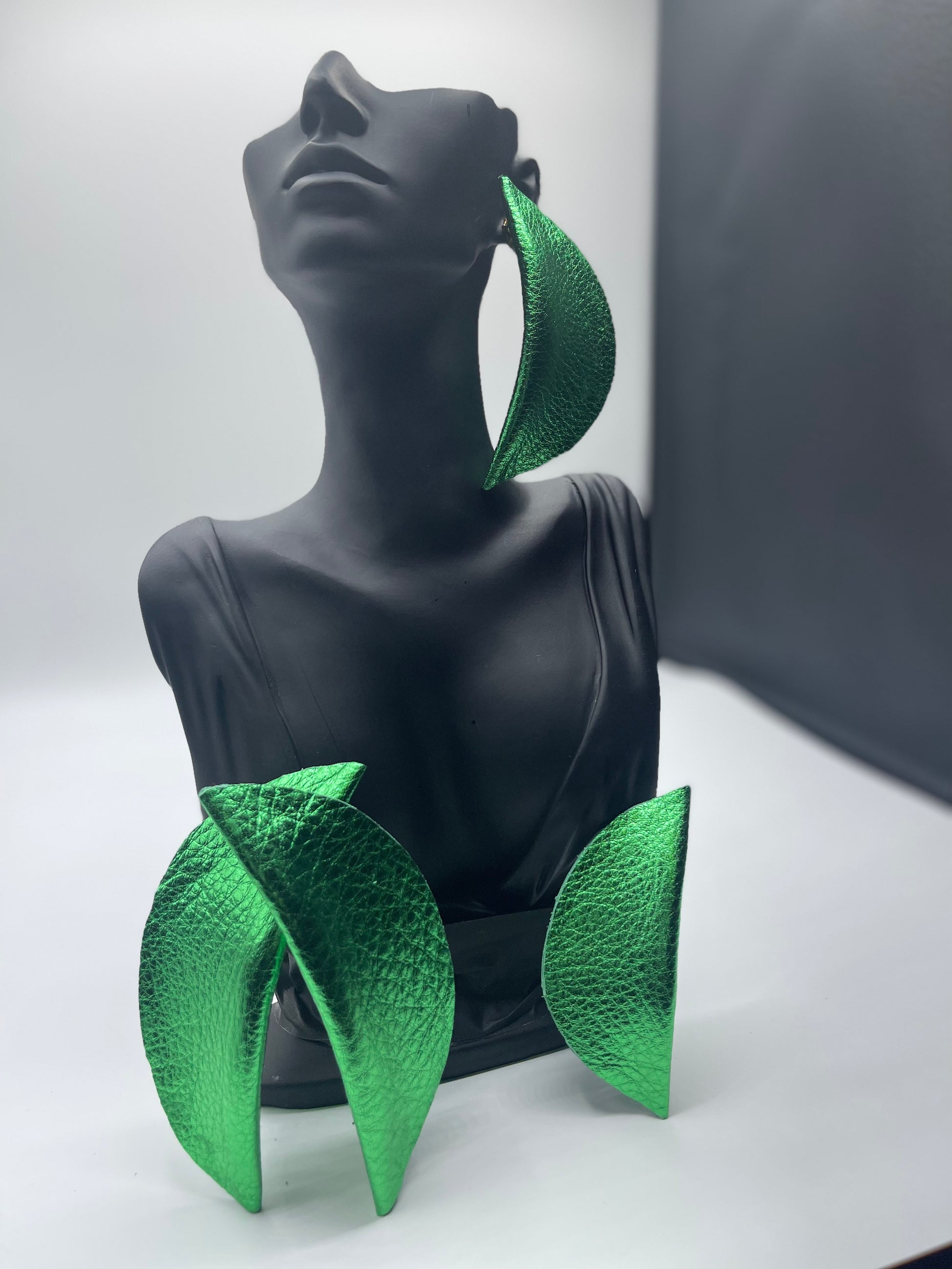 Kelly Green Metallic Leather Earrings with slight curvature.