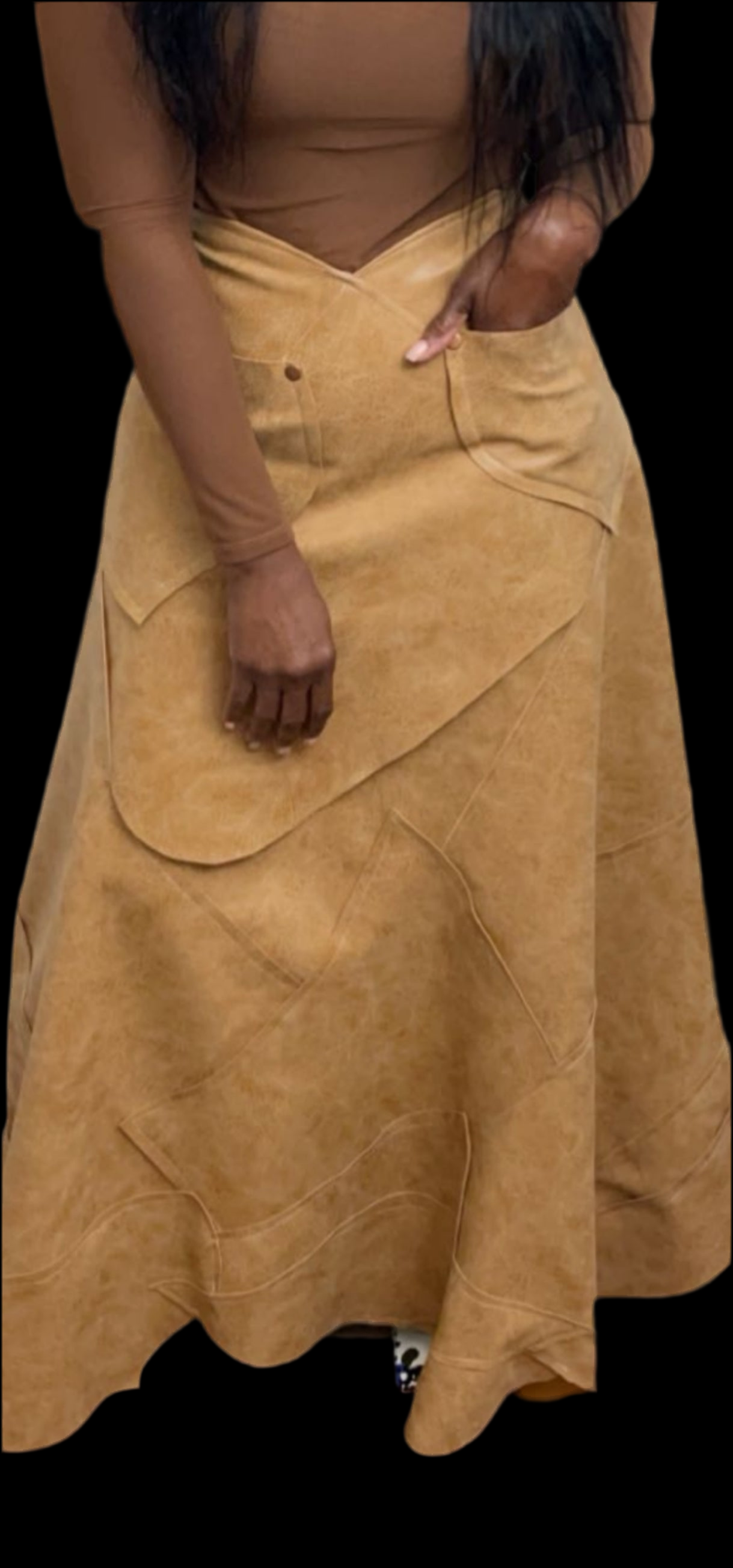 Leatherette ( Vegan Leather) Patchwork Constructed A-Line Skirt. This Beauty is Handmade with Abstract Pieces Strategically Placed to create our Masterpiece. Front/Side Pockets are a beautiful addition to this piece. Visible Stitching and Bronze Studs. Fabric has 1% Elasticity. Unlined and Raw Edges.