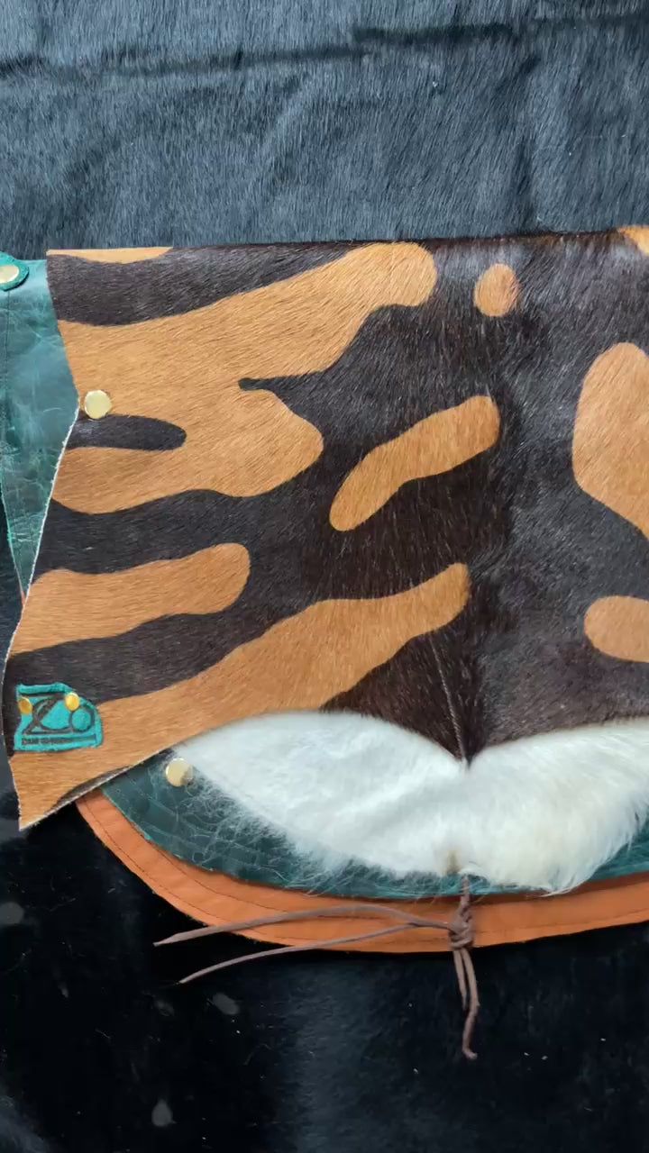 Genuine Teal Green Leather Fold Over Crossbody/Clutch with Caramel and Chocolate Brown Calf hair Details.