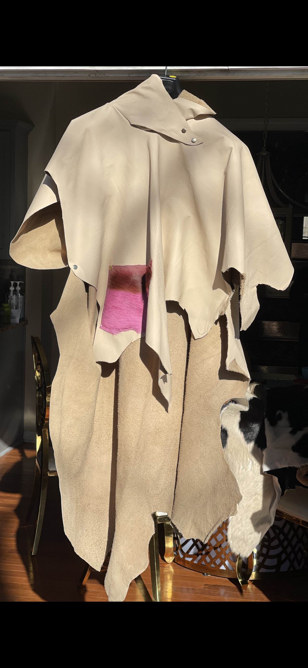 Genuine “Cream” Leather Draped Kaftan Detailed with Pink/ Chocolate Brown Cowhide Accented Pocket and Z.Co Logo. Leather Mock neck Collar/ Studded Finish. Our Z.CO Beautiful Kaftan’s can be Worn over your Favorite Oversized Sweater, Sweatshirt, Denim Shirt and so much more.