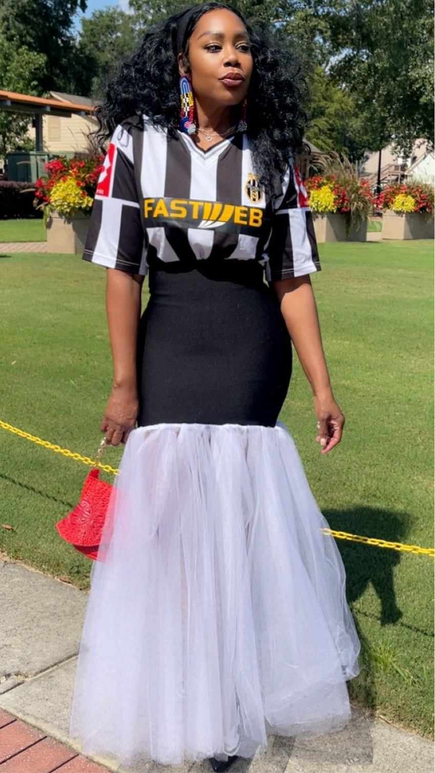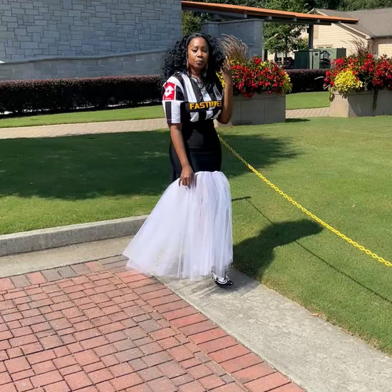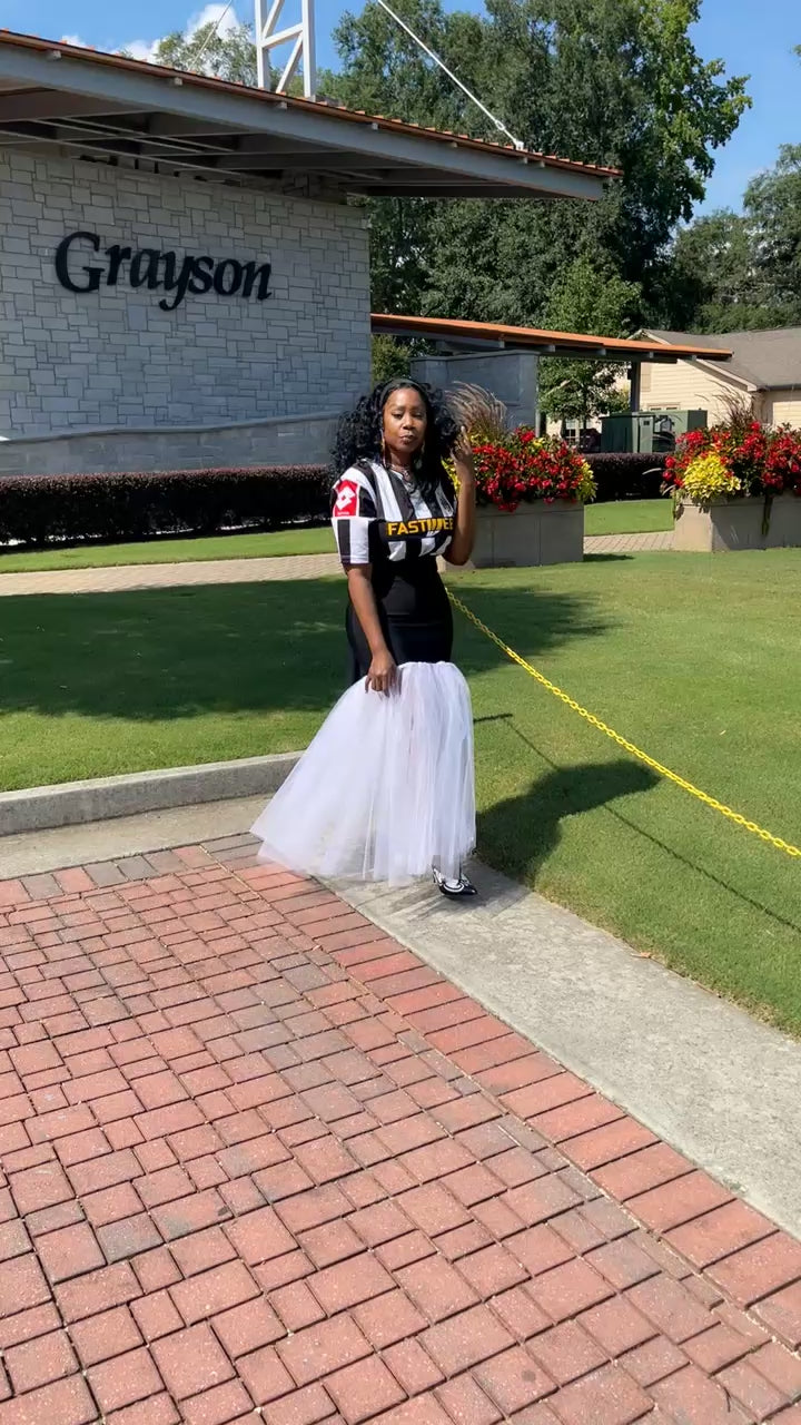 Black and white Soccer Jersey Dress with large white number on the back. Red /Yellow patches. Connected to black bandage skirt trimmed with tulle.