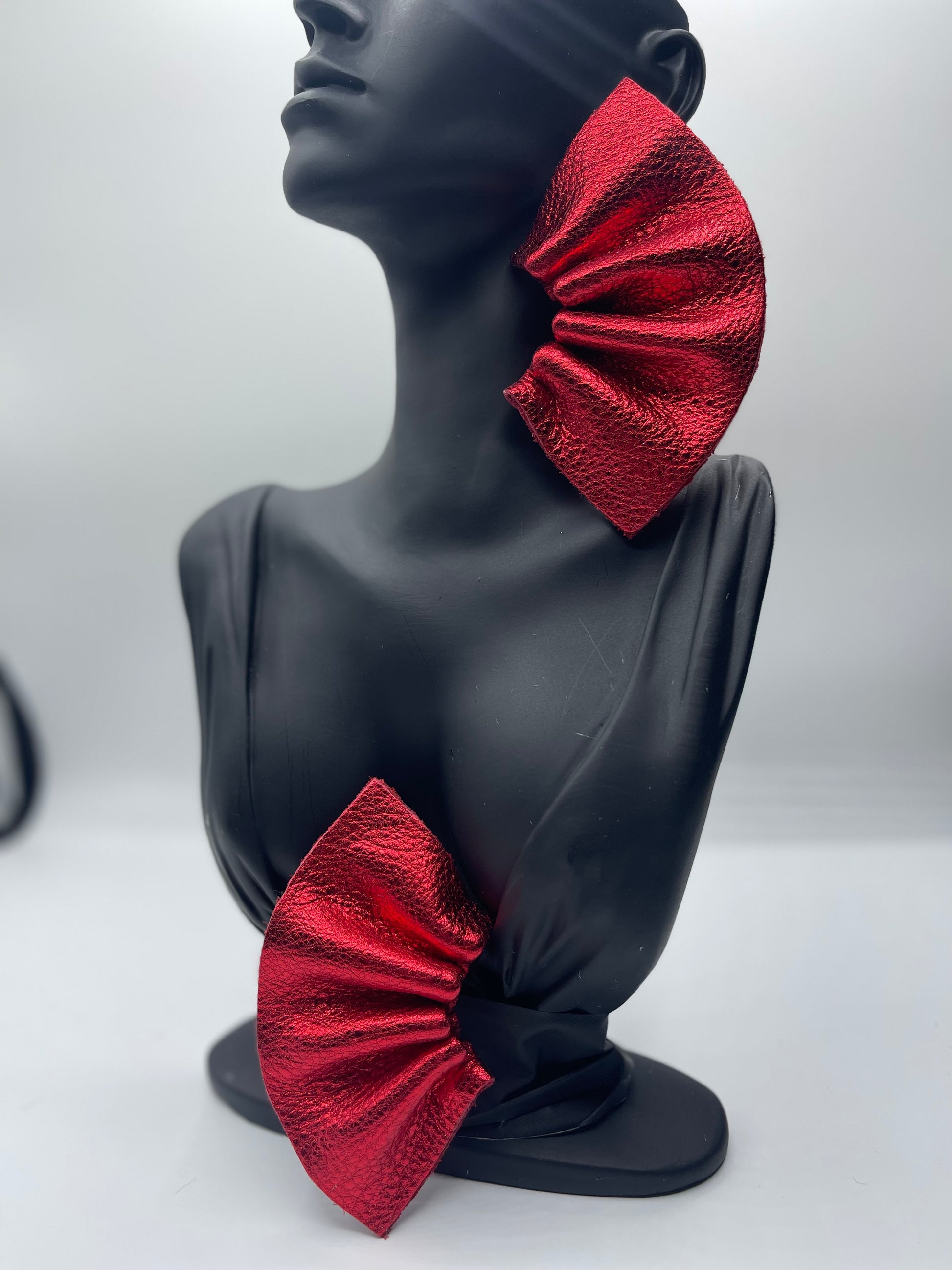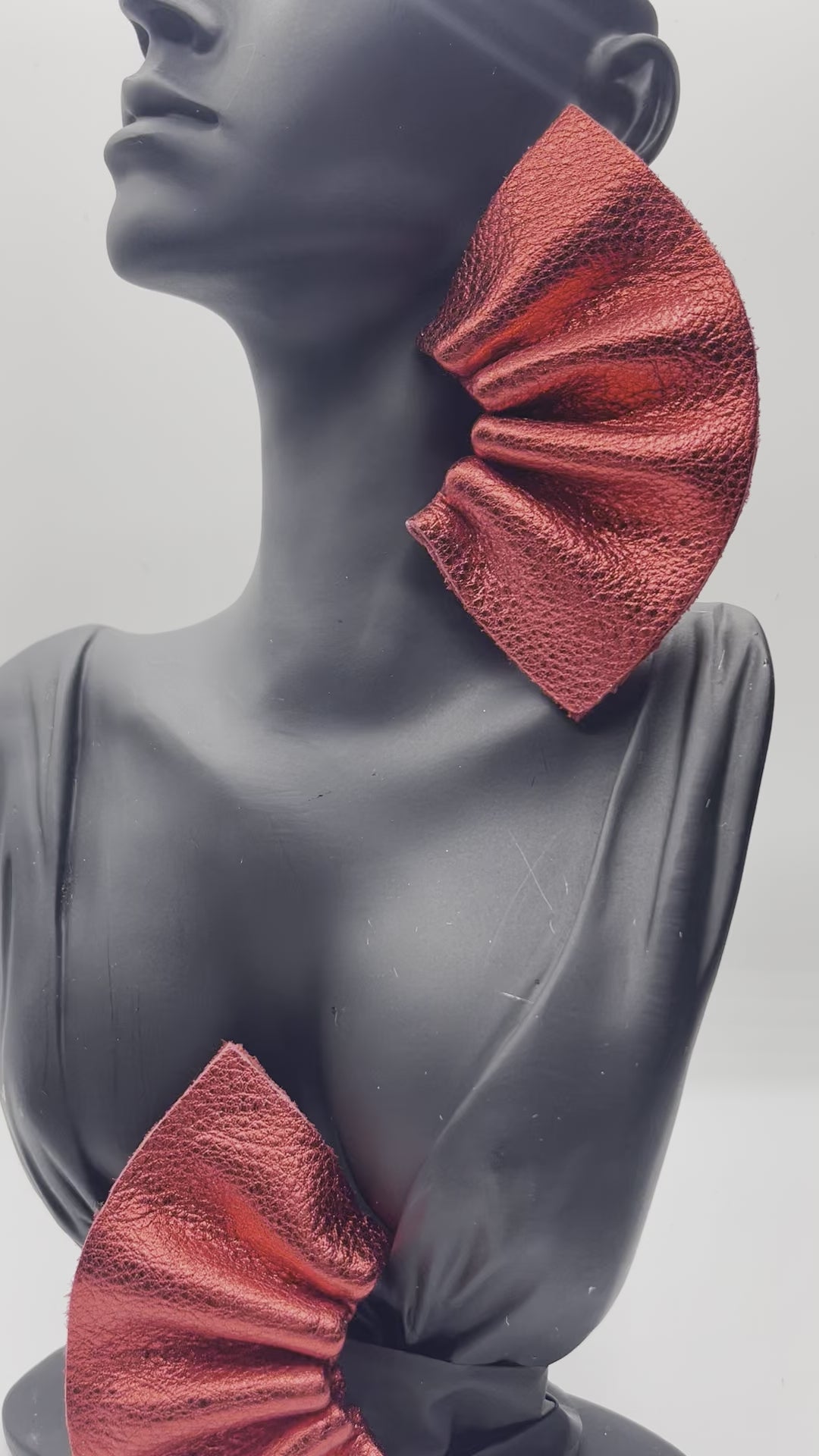Crimson Red Metallic Leather Earrings with Rippling Details. Lightweight.