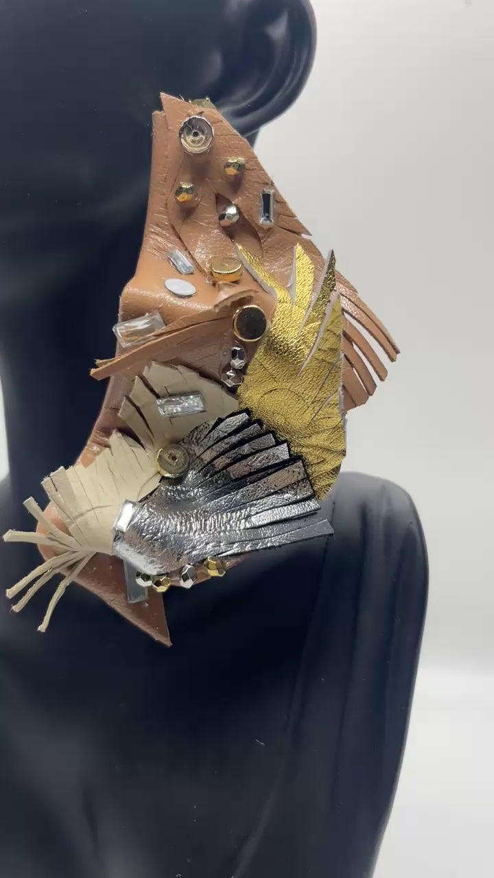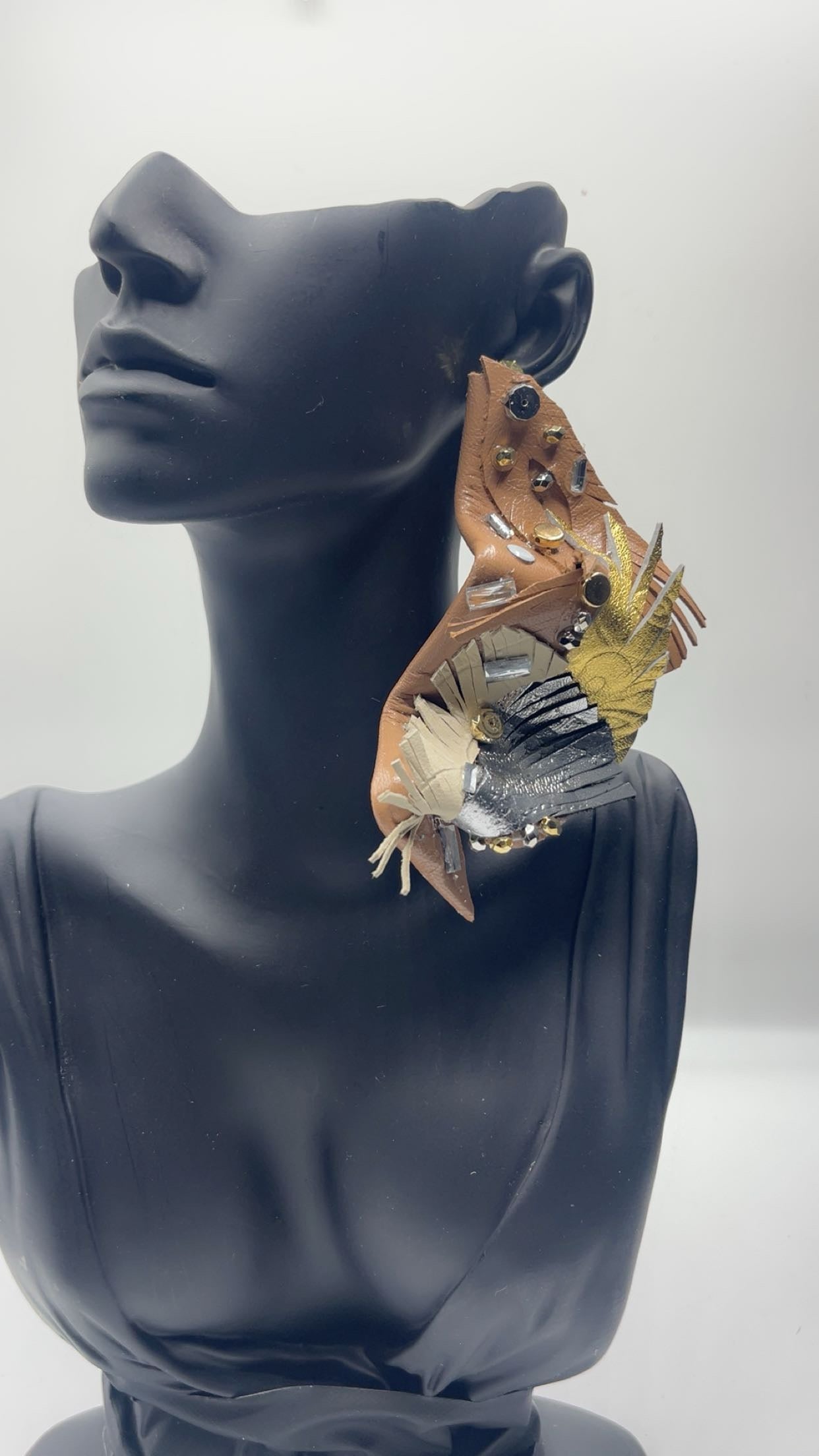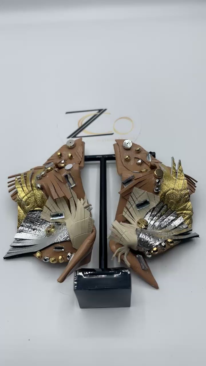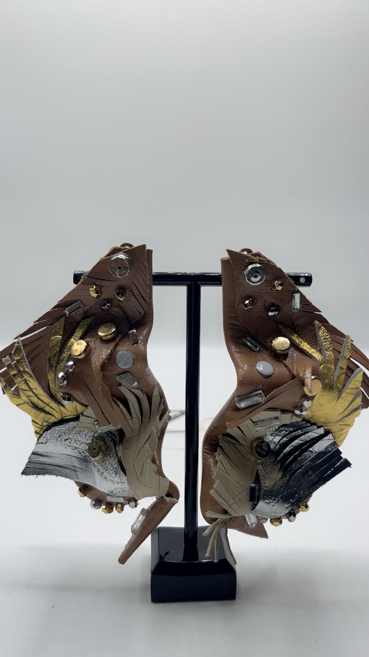 Nude/ Blush Native American Inspired Handmade Earrings with Layered Leather, Studded and Beaded Details Intricately Placed to Create Wearable Art.