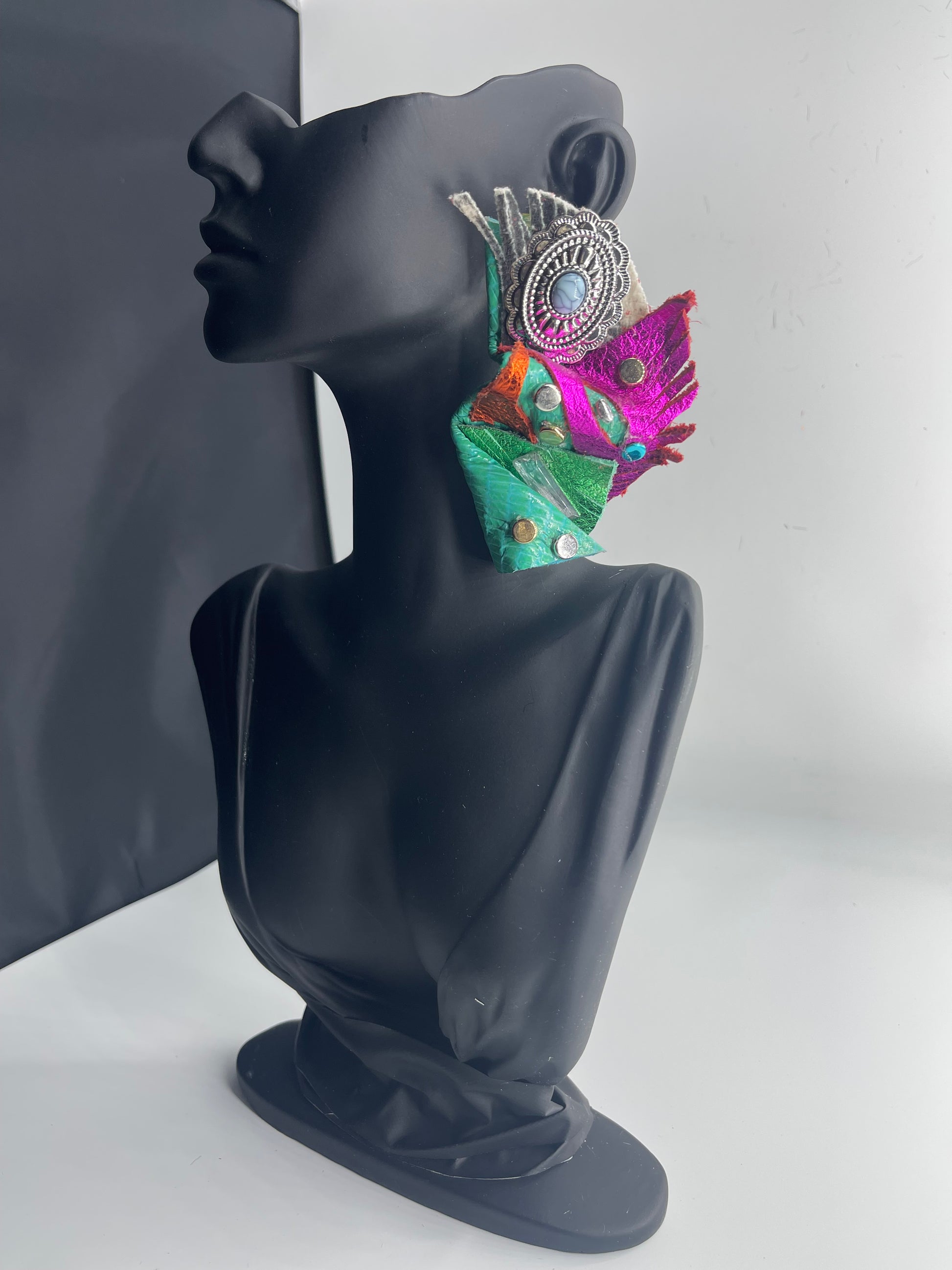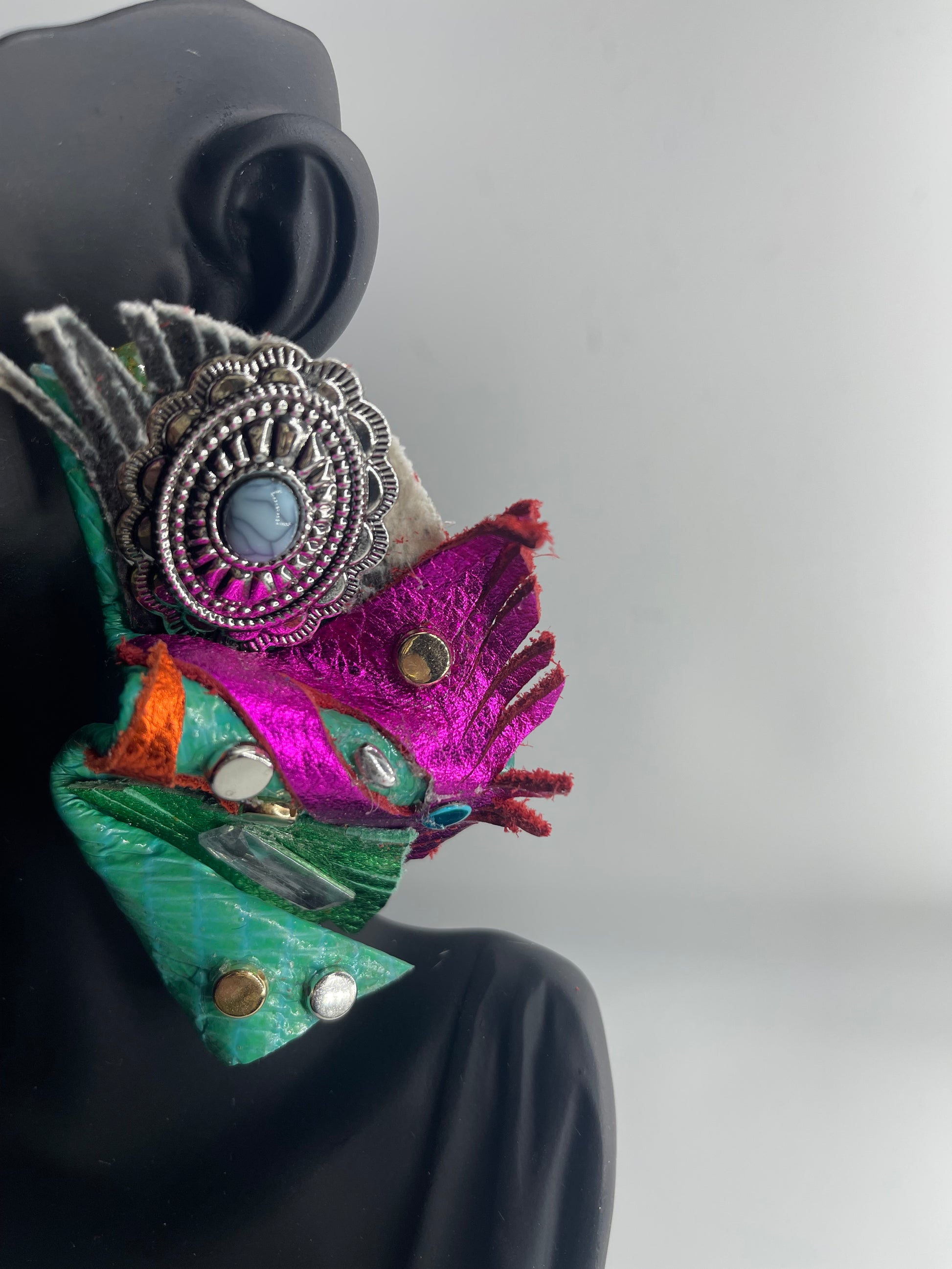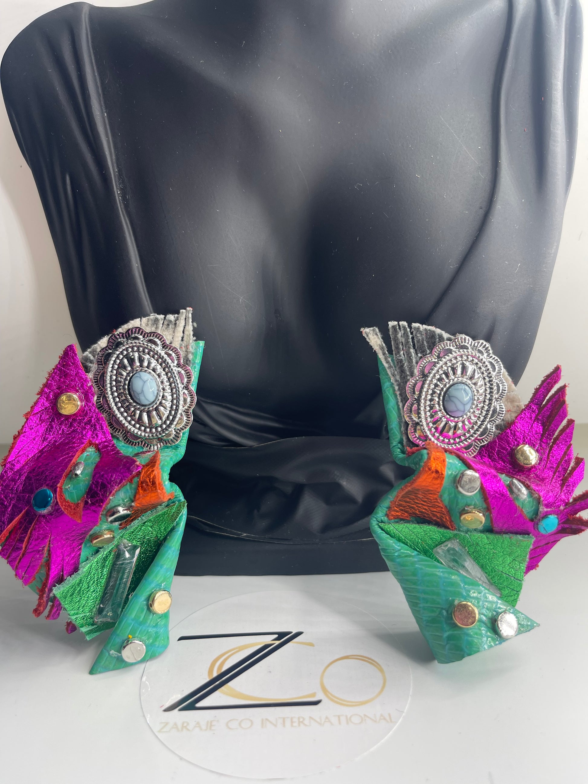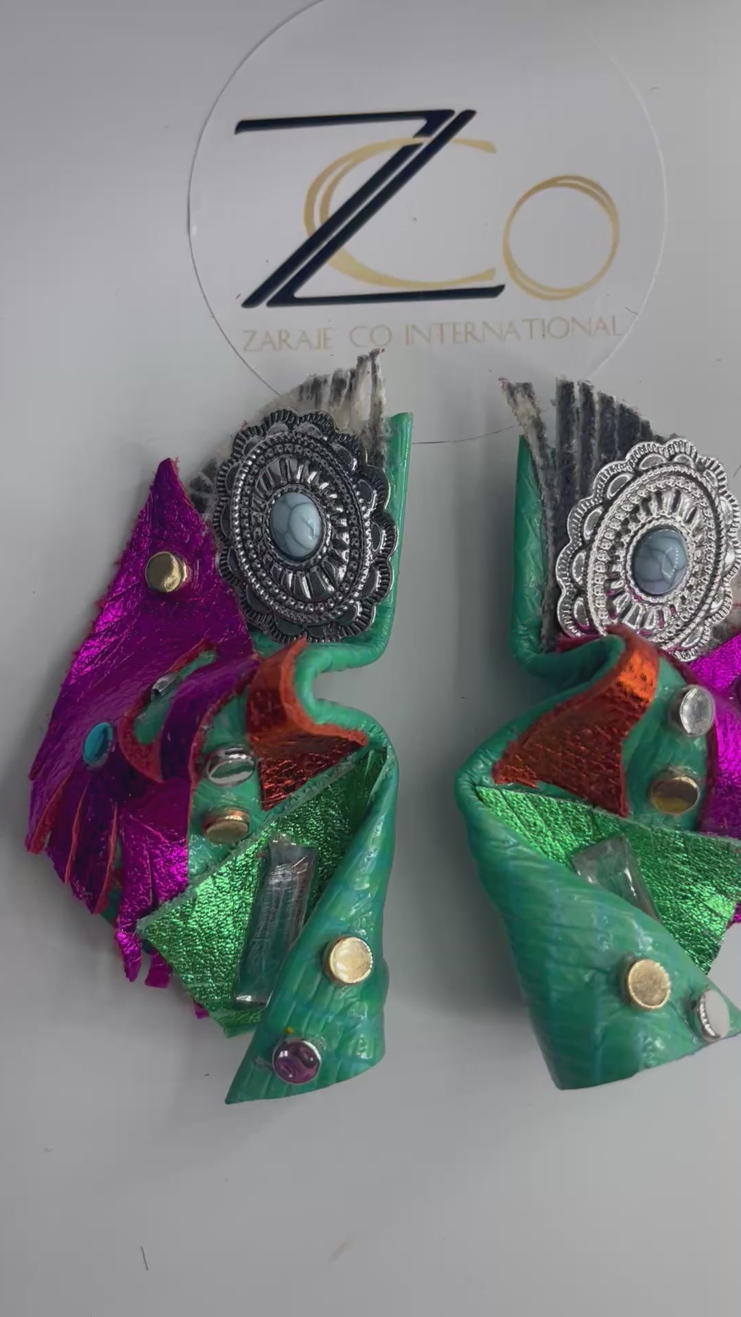 Teal/Snakeskin Native American Inspired Handmade Earrings with Layered Leather and Studded Details Intricately and Beautifully Placed to Create Wearable Art.