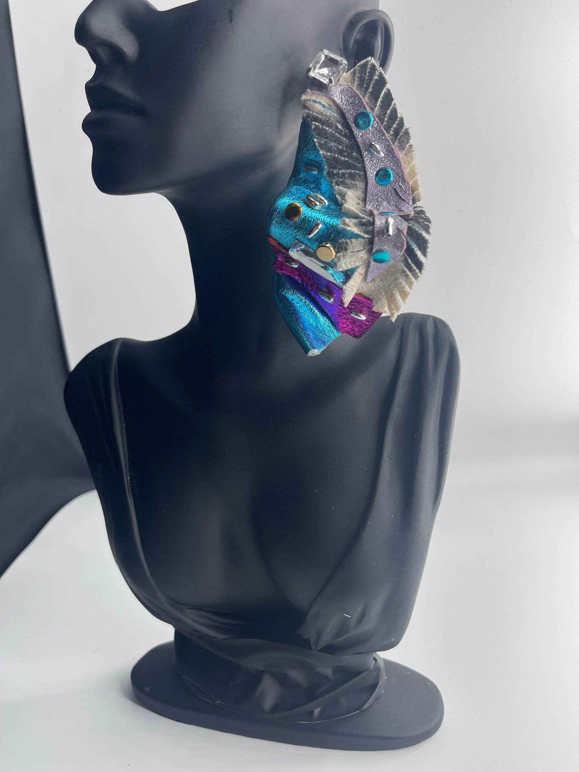 Turquoise Metallic Native American Inspired Handmade Earrings with Layered Leather and Studded Details Intricately and Beautifully Placed to Create Wearable Art.