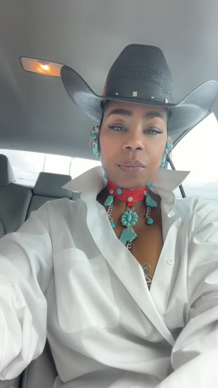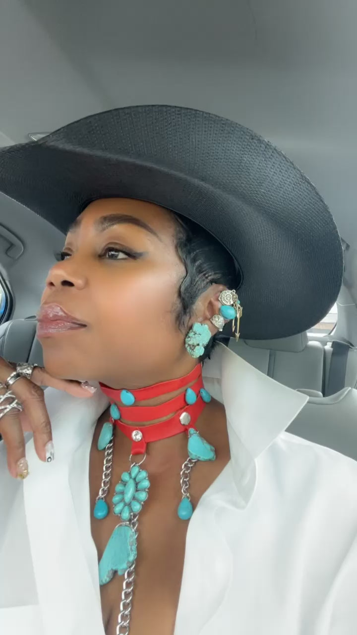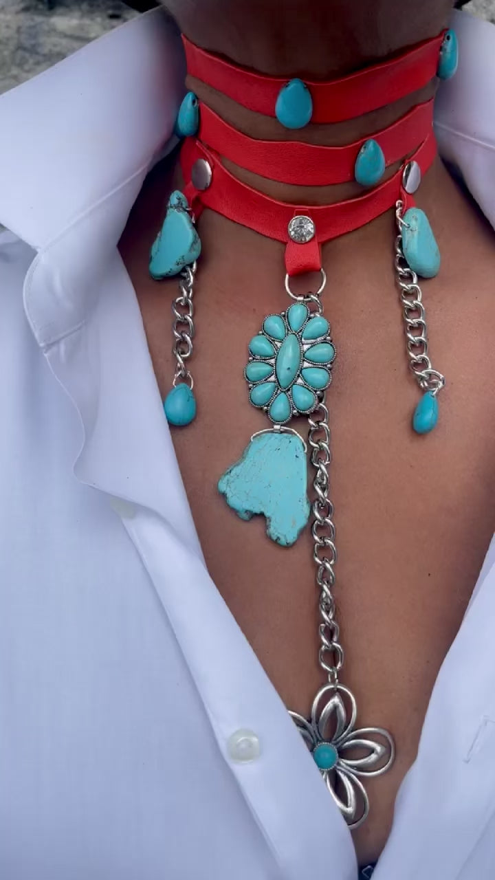 Red Leather Wrap Around Choker with Turquoise Stone Embellishments & Studded Details.