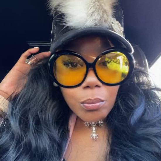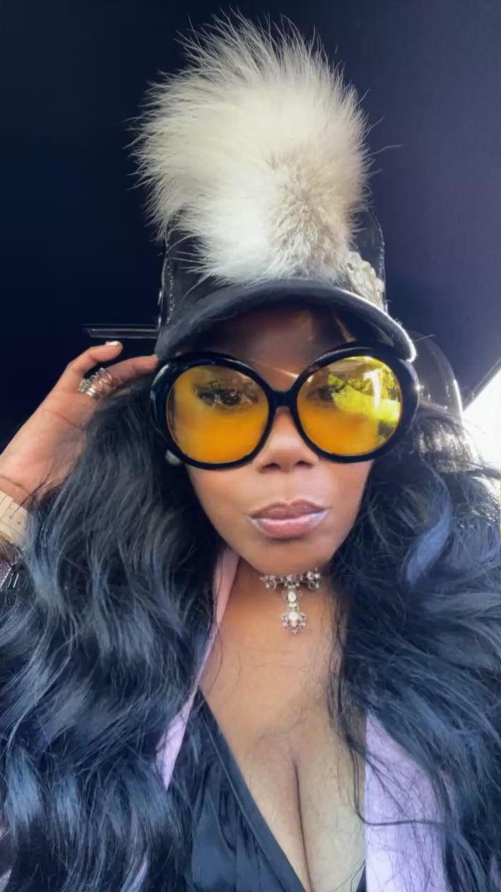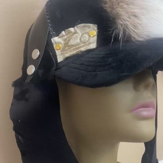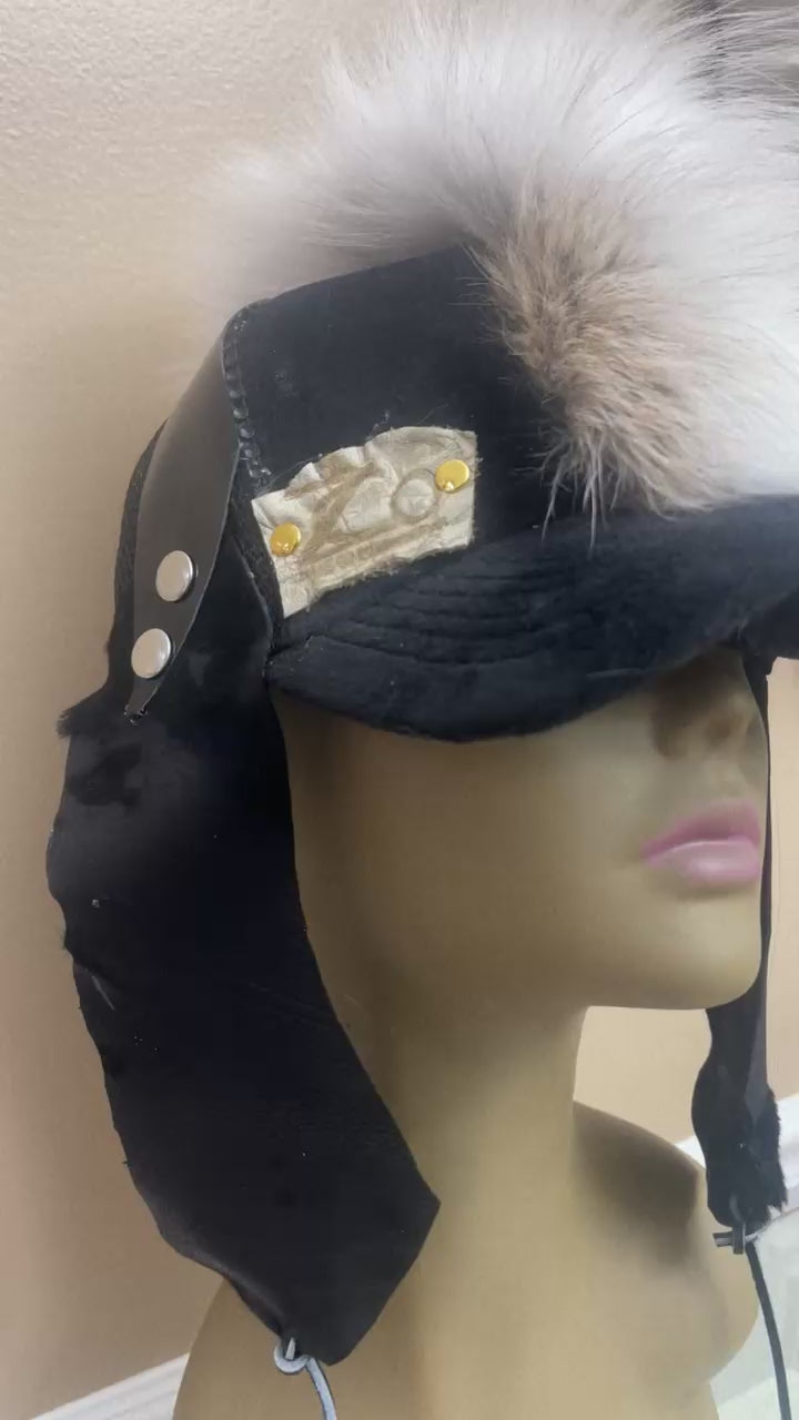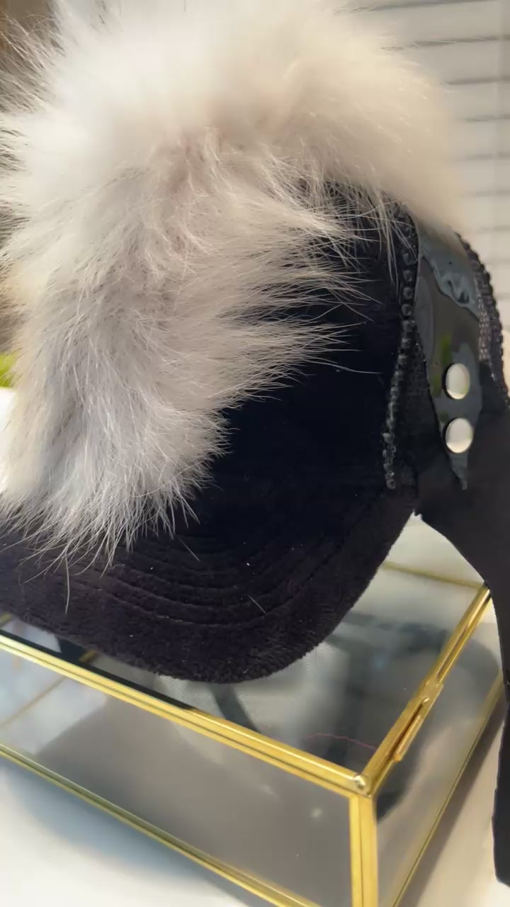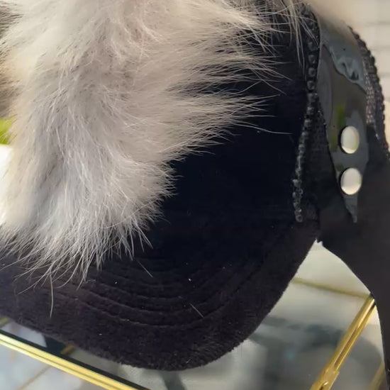 Black Velour/Velvet Trucker Hat with snap adjustments for perfect sizing. Embellished with a White Foxtail Mohawk placement. Black Leather Ear flap covers and black leather tie strings. Z.Co Logo in Cream.